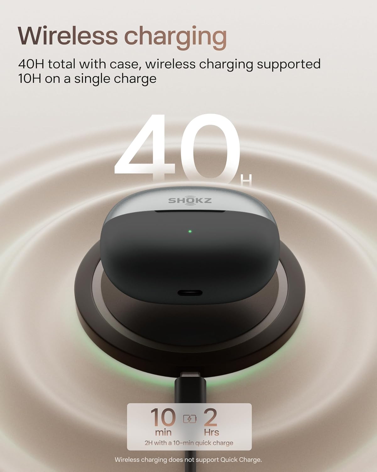 - Up to 40 Hours of Listening—Enjoy 10 hours on a single charge and up to 40 hours with the charging case. A 10-minute quick charge provides 2 hours of playtime. Wireless charging is supported (quick charge is not available via wireless charging).