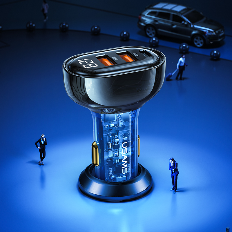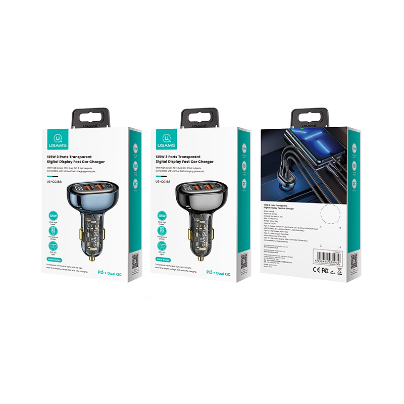 Power up on the go with the USAMS US-CC158 125W 3-Port Fast Car Charger, designed for ultra-fast charging, multi-device support, and a sleek transparent digital display. With 125W total output and intelligent power distribution, this Icicle Series charger ensures your smartphones, tablets, and laptops charge at maximum speed while keeping an eye on real-time voltage and power status.